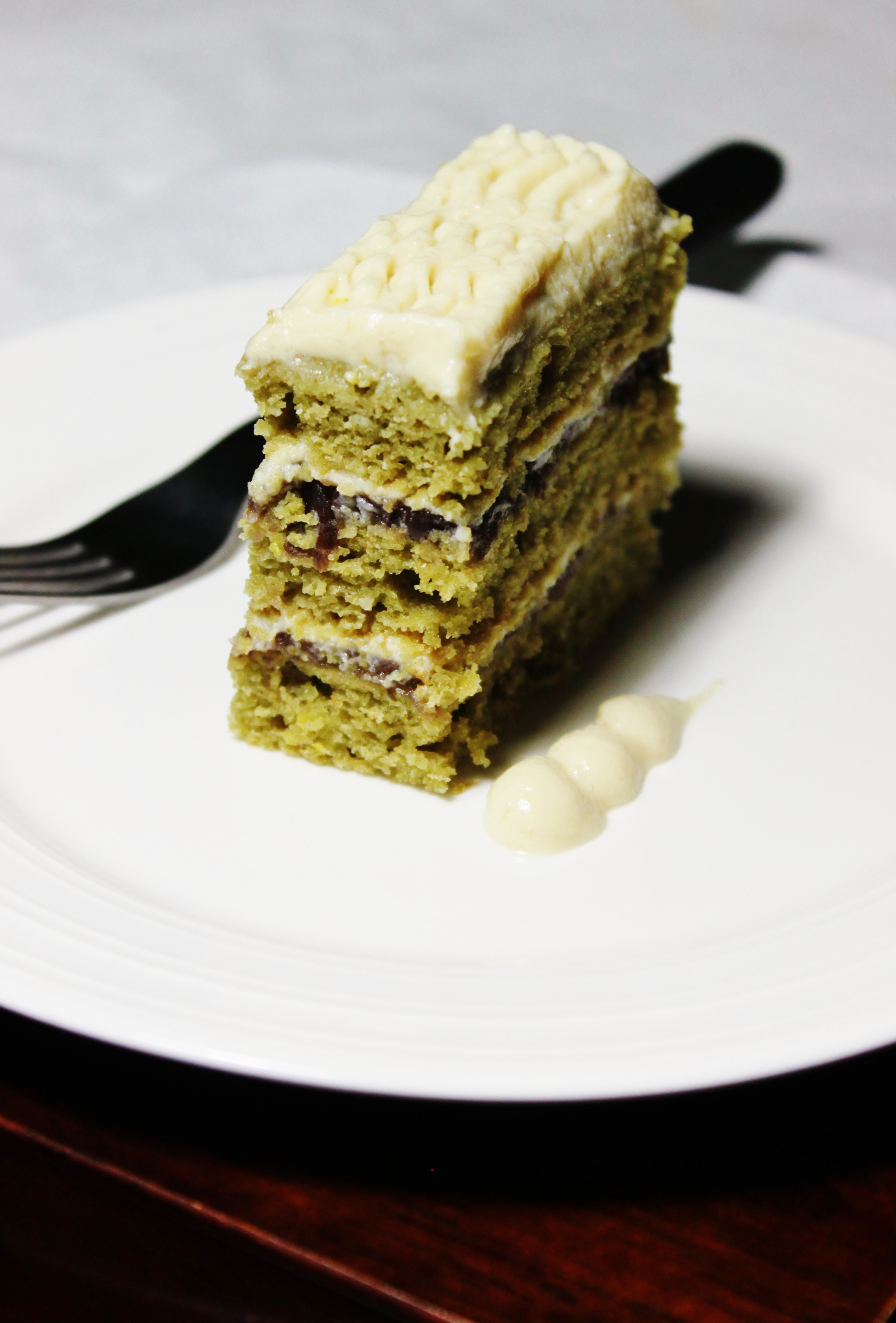 For that matter, I’ve made myself two vegan little cakes. To let you in on a few sweet details, there’s eight layers, made from three components: matcha sponge, adzuki paste, and tofu cream. The tofu cream, a recipe by Young Mo Kim (Korea’s Father of baking), is light and airy, much like freshly whipped cream, though I assure you, it is 100% natural and vegan. One thing I’ve noticed about his recipes, is that he adores the use of lemon, both peel and juice. This cake is without a doubt the best matcha cake I know, but I humbly advise you to keep an open mind, because this cake has nothing cliche about it; and the surprise starts at the very tip of the icing.