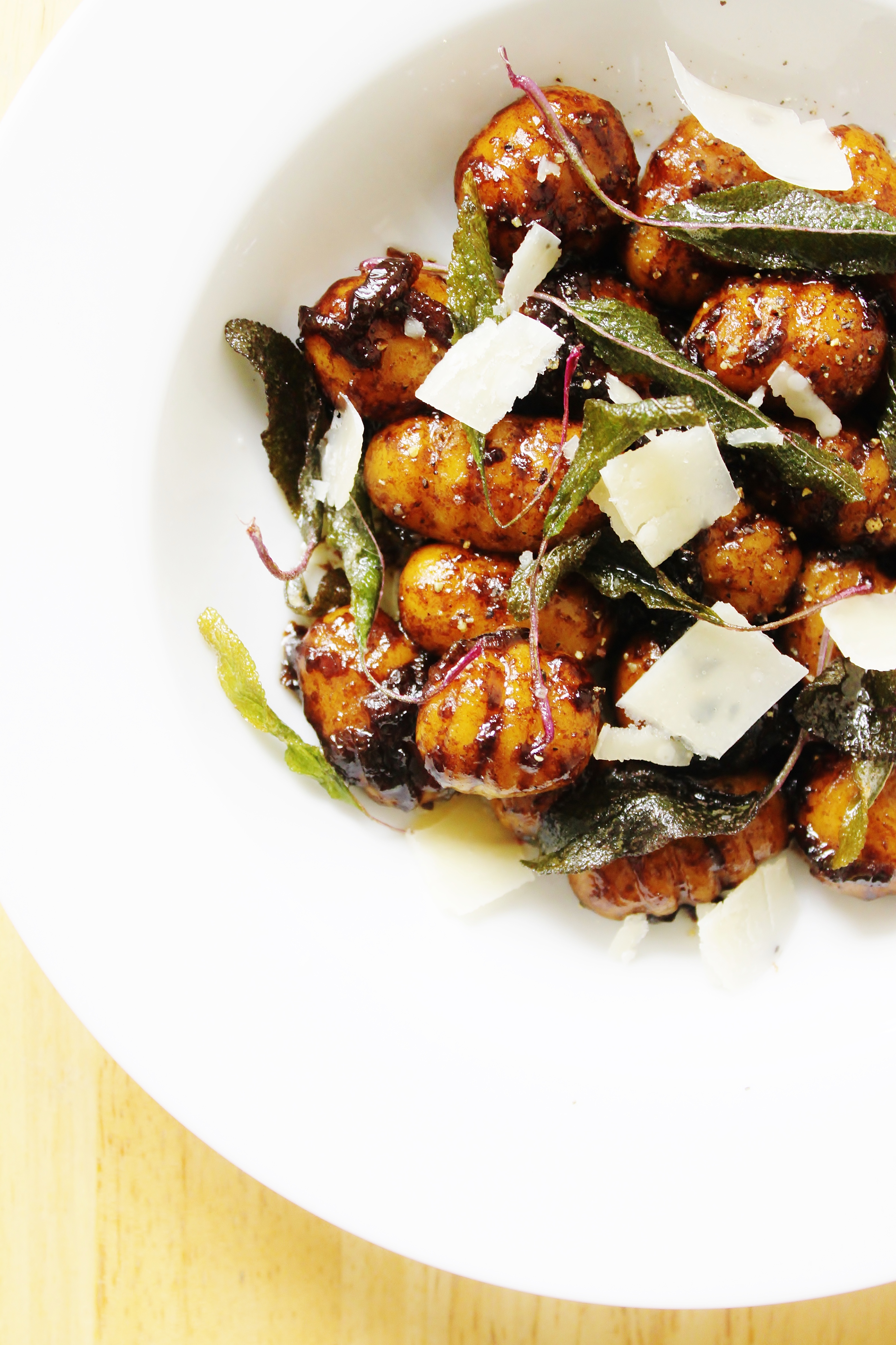 Crisp purple sage, kabocha squash gnocchi, brown butter, shaved Grana Padano, and caramelized balsamic vinegar.