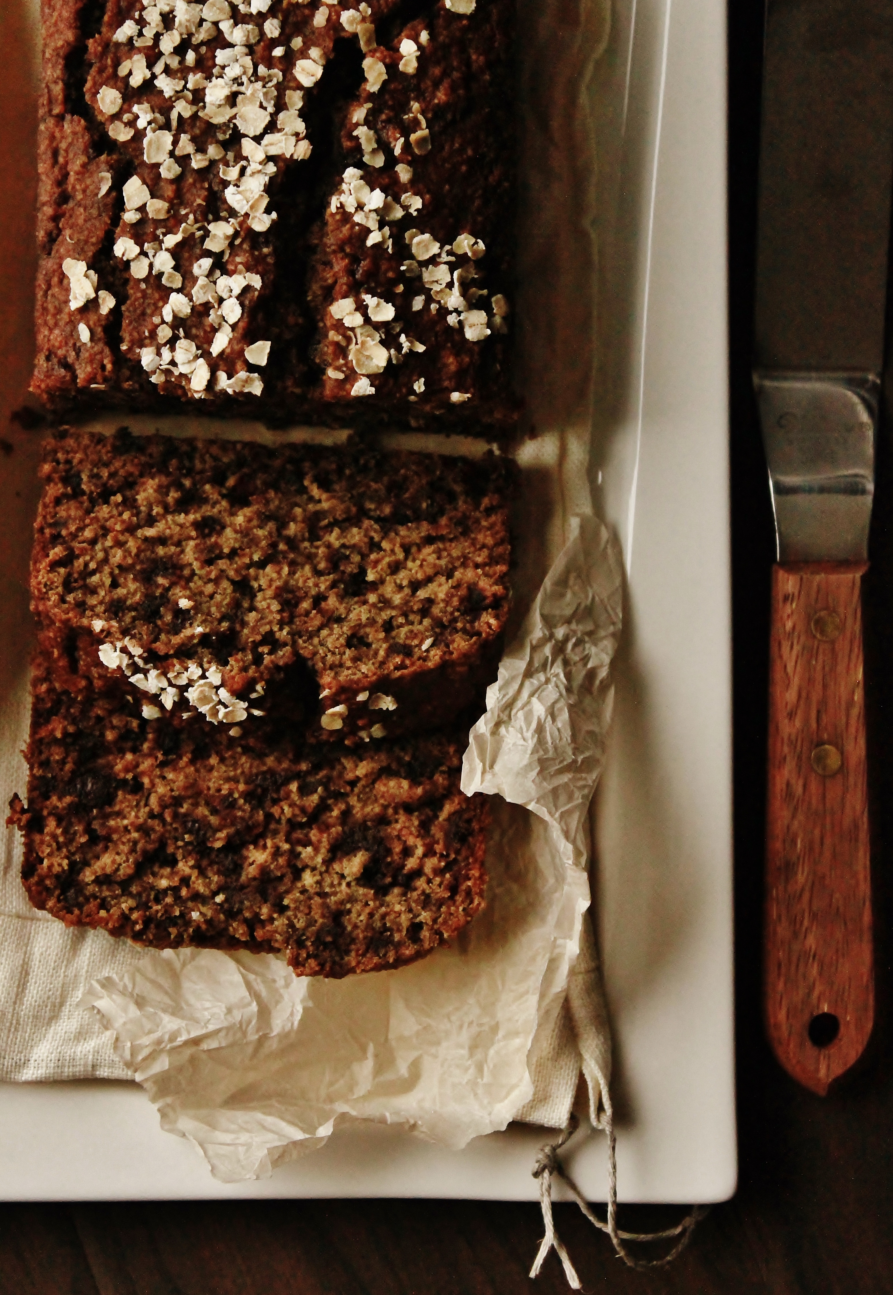 Next, puree the banana, coffee granules, coconut oil, brown sugar, and vanilla until smooth. Pour this into the oat flour mixture and stir just until combined. Fold in the chocolate chips. Scrape the batter into the prepared pan and sprinkle some oats on top.