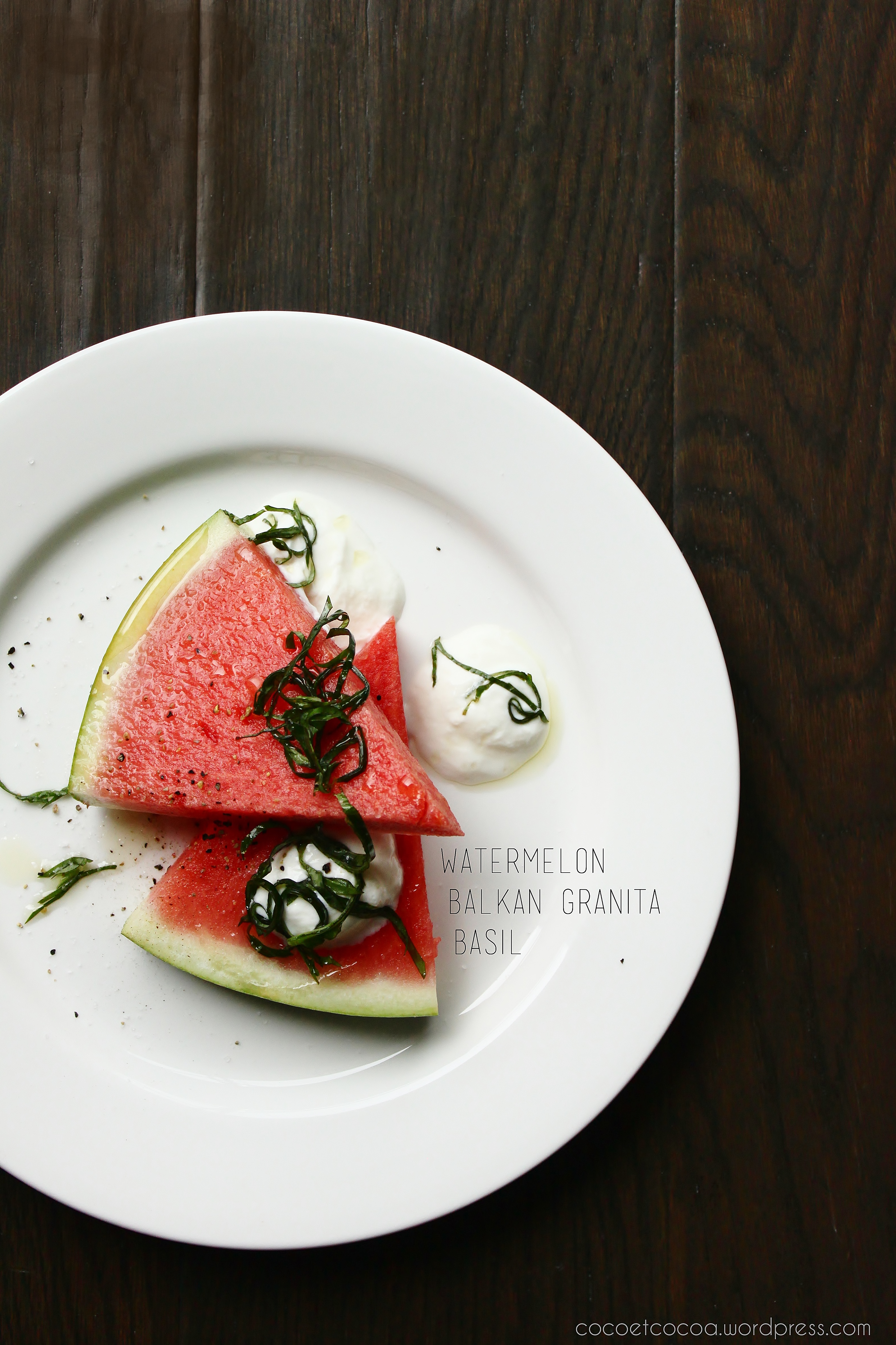 Once that’s done, take the plates out of the freezer. Put the watermelon on the plates, dot with the balkan granita, garnish with basil, drizzle with olive oil, and season. (Just get everything on that plate.)