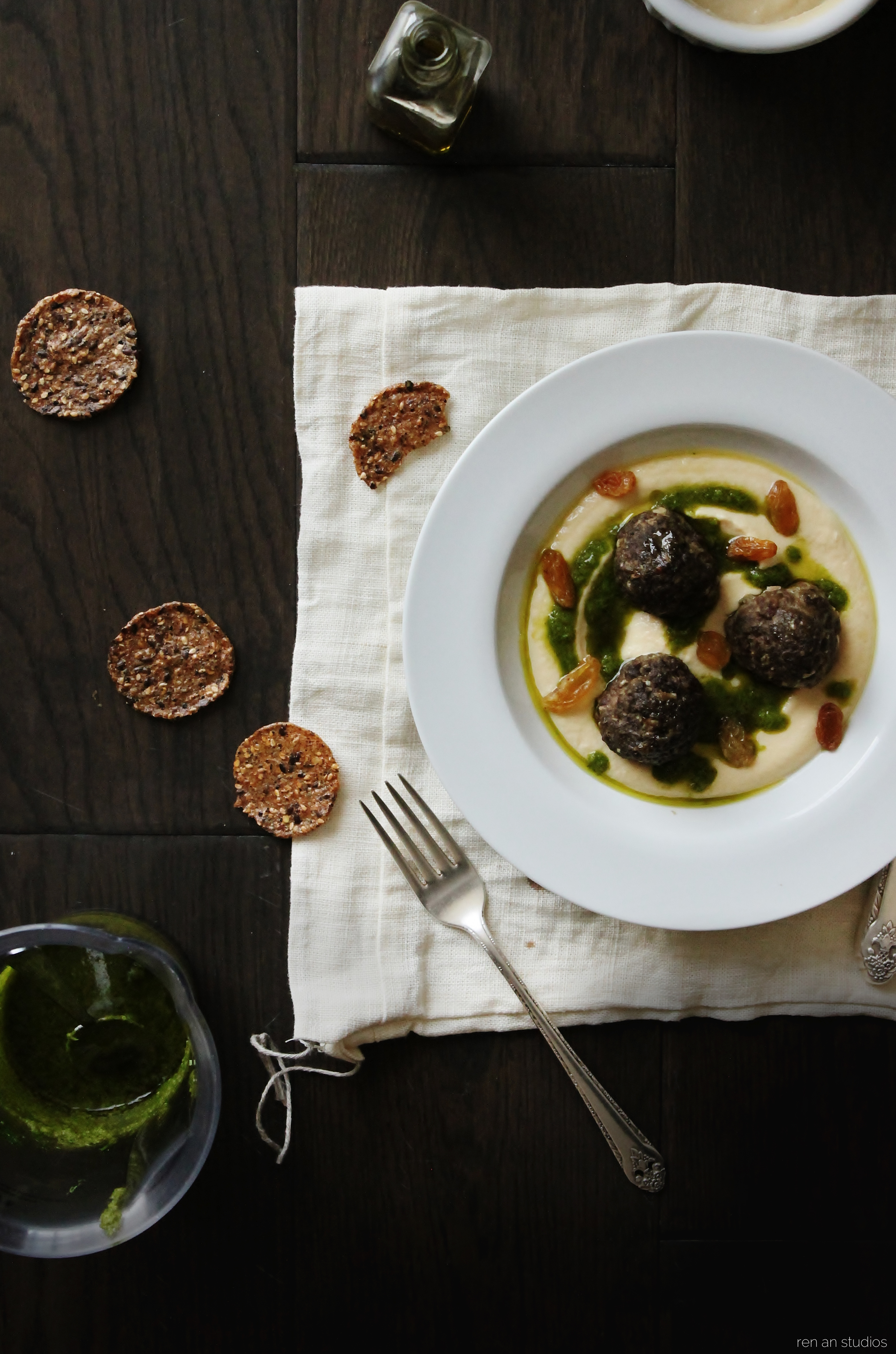 To assemble, spoon a large dollop of hummus into small salad plates. Splatter a bit of the parsley oil on top, then add a few koftes/meatballs. Finish with a small handful of sultana raisins and a round or two of freshly cracked black pepper.