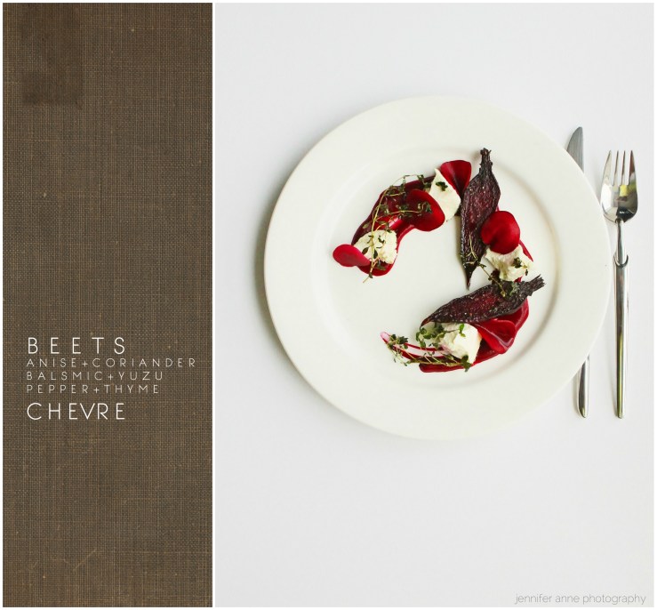 So apparently when I get emotional I don’t consume food…I produce it, and often that’s when I come up with the better half of my kitchen endeavours. And this dish is full of psychotic pinks that will stain not just your fingers should you touch it, but also your precious white Club Monaco shirt should you dare to wear it to dinner. Beets, that’s right, in my three favourite variations of it: butter-basted with fried thyme for meatiness, candied and pureed with yuzu and EVOO for richness, and pickled with anise and coriander for crunch and tartness. If you remember Heart Beets from way back, this one would definitely be an upgrade as it pays more respect to the natural beauty of this revered root. And of course, you’ll see chevre at the party too.